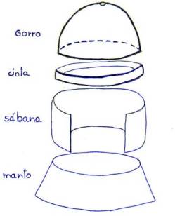 Cuando lo tengas hecho, lo unes al gorro y ya tenemos una cofia, pero queda más bonita unida a un manto de obispo que ya sabes hacer; lo unes como siempre, dos de cada lado.